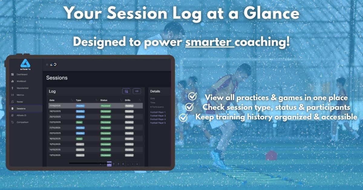 From the left panel, selecting Sessions gives access to the full training and match history log. Here, you can check the date, the type of session (Practice or Game), and the processing status. It is the control center where all your data begins to take shape.