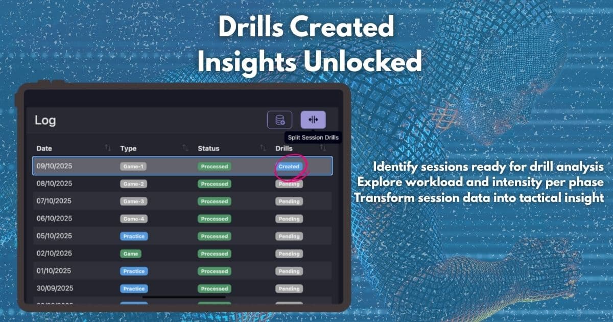 Inside the Sessions log, each entry includes a Drills column. When you see the label Created, it means you have defined the drill segments for that session. By selecting it, you can review the drills you set up according to your arranged plan and analyze load, intensity and outcomes for each segment exactly as intended for the training.